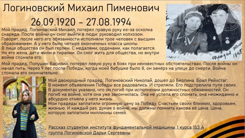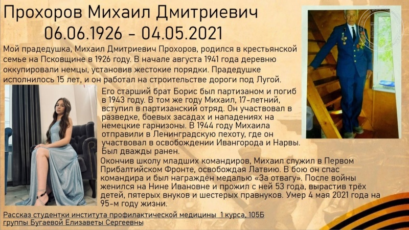 Участниками акции стали активисты «Я горжусь!» СЗГМУ и студенты СЗГМУ им. И.И. Мечникова. Ребята поделились историями о подвигах своих родных — тех, кто сражался на фронте, работал в тылу и делал всё для приближения Победы. В этих рассказах оживает память о событиях прошлого, которая навсегда останется в сердцах нашего народа!