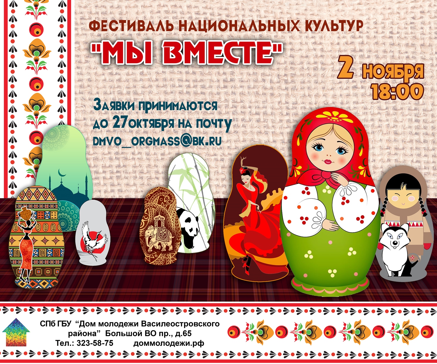 2 ноября 2017 года в 18:00 СПб ГБУ «Дом молодежи Василеостровского района Санкт-Петербурга» приглашает всех представителей многочисленных культур, населяющих наш город, а также всех желающих окунуться в интереснейший мир человеческого мироздания, принять участие в фестивале национальных культур «Мы вместе», посвященном празднованию Дня народного единства и Дня толерантности.