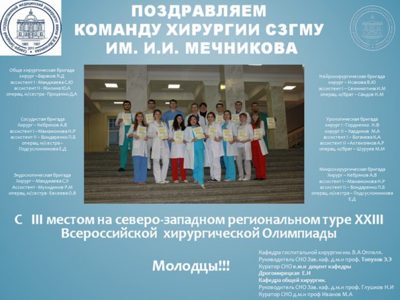Непосредственное участие в подготовке команды приняли кураторы кружков СНО: кмн доцент кафедры госпитальной хирургии им. В.А. Оппеля Дрогомирецкая Е.И. и дмн профессор кафедры общей хирургии Иванов М.А.