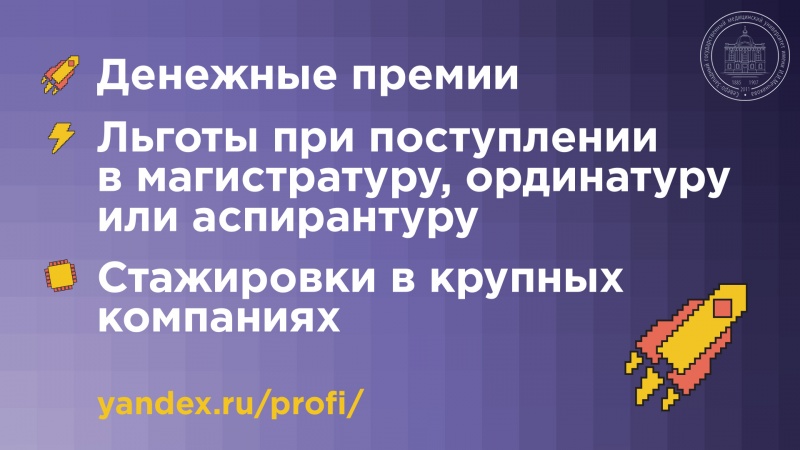 Приглашаем подать заявку и побороться за денежные премии, льготы при поступлении в ординатуру, магистратуру или аспирантуру ведущих вузов страны, а также возможность пройти стажировку в крупной компании.