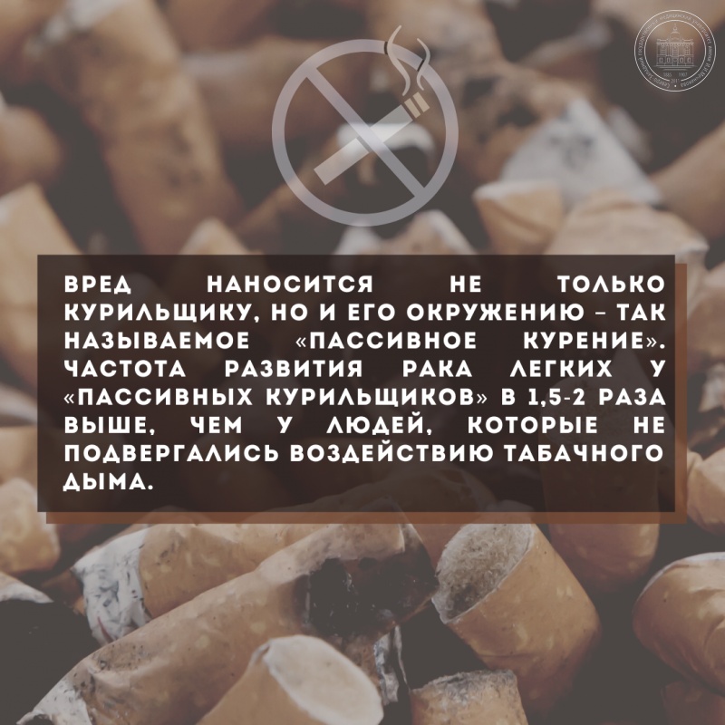 — Конечно, не следует забывать, что вред наносится не только курильщику, но и его окружению – так называемое «пассивное курение». Частота развития рака легких у «пассивных курильщиков» в 1,5-2 раза выше, чем у людей, которые не подвергались воздействию табачного дыма.