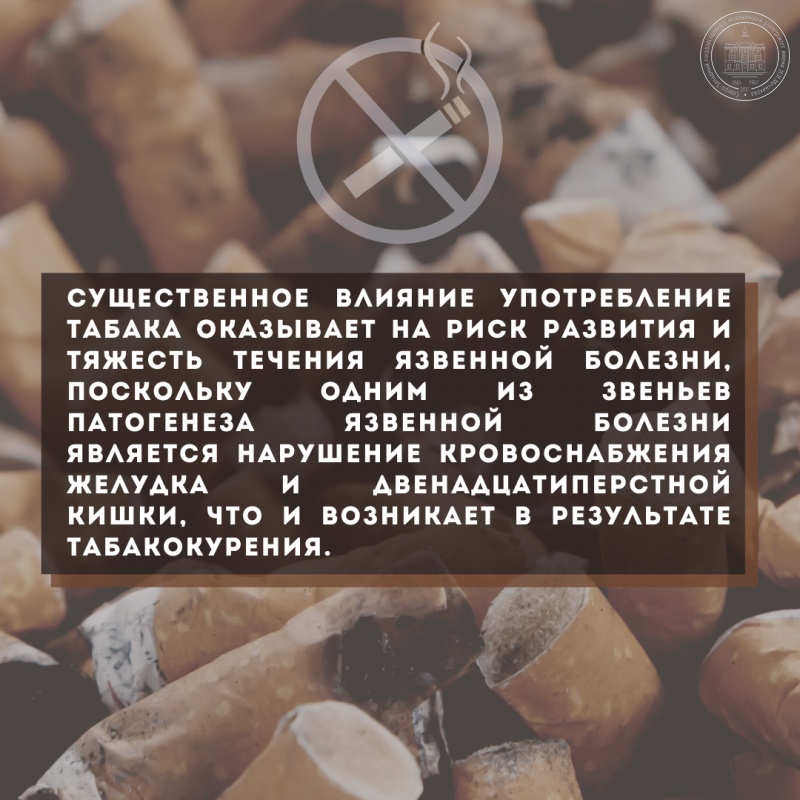 Также стоит отметить, что курение усугубляет течение не только заболеваний органов дыхательной и сердечно-сосудистой системы. Существенное влияние употребление табака оказывает на риск развития и тяжесть течения язвенной болезни, поскольку одним из звеньев патогенеза язвенной болезни является нарушение кровоснабжения желудка и двенадцатиперстной кишки, что и возникает в результате табакокурения. Таким образом, курильщикам, страдающим язвенной болезнью, а также предъязвенными состояниями (напр. гастрит, дуоденит) стоит всерьез задуматься о прекращении курения. Из всего выше сказанного следует, что курение представляет серьезную медико-социальную проблему, для решения которой требуются значительные медицинские и финансовые ресурсы.