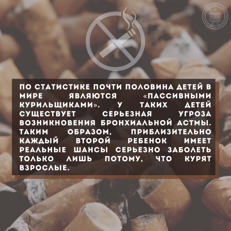 Также не следует забывать о таком заболевании, как бронхиальная астма. Основная категория больных бронхиальной астмой – дети. По статистике почти половина детей в мире являются «пассивными курильщиками». У таких детей существует серьезная угроза возникновения бронхиальной астмы. Таким образом, приблизительно каждый второй ребенок имеет реальные шансы серьезно заболеть только лишь потому, что курят взрослые.