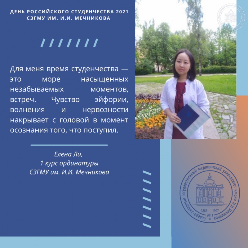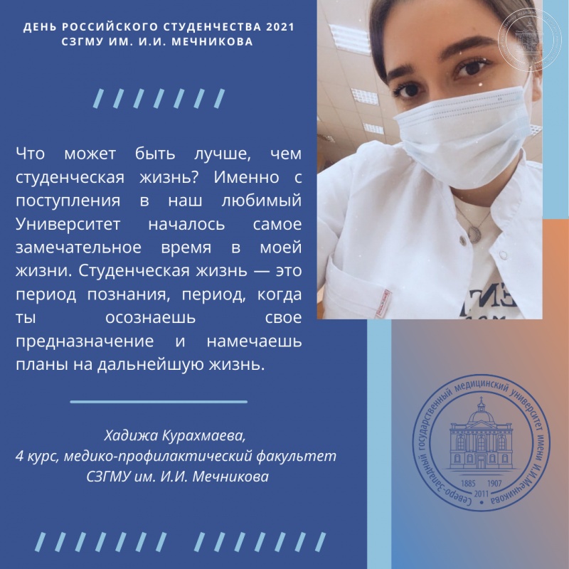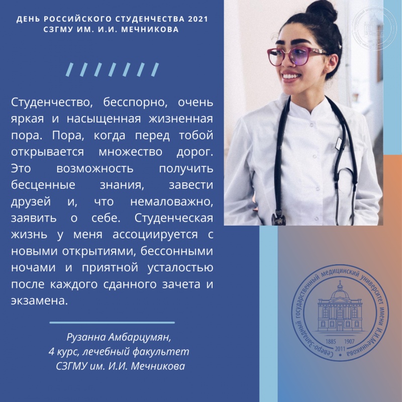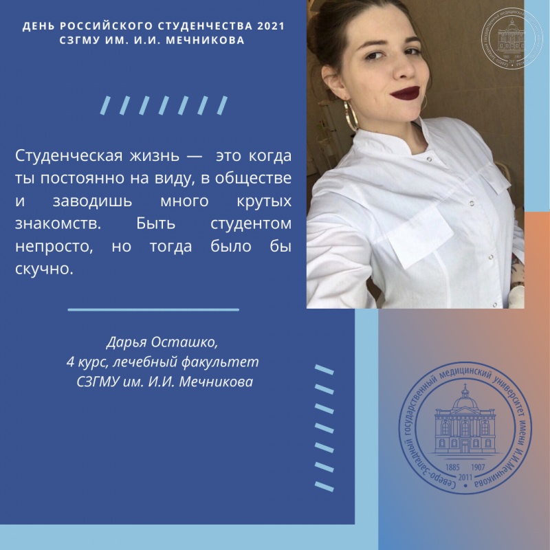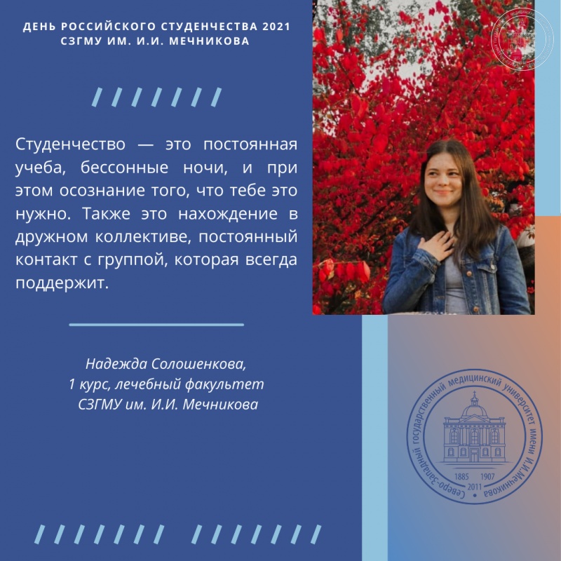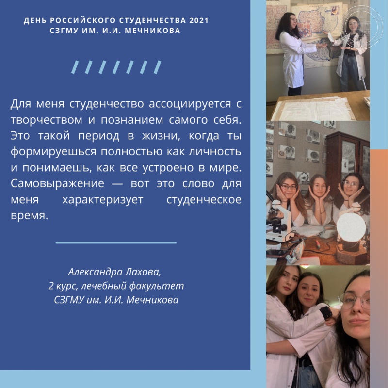 В свою очередь, отдел по связям с общественностью СЗГМУ им. И.И. Мечникова обратился в день российского студенчества к обучающимся Университета с вопросом «Что для вас значит студенчество, с чем оно ассоциируется и какие вызывает эмоции?».