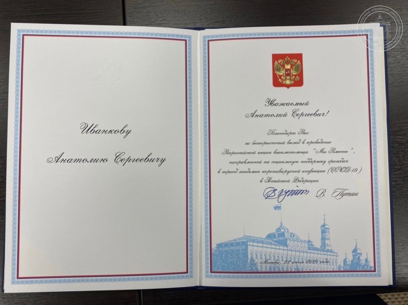 Руководитель регионального отделения Общероссийского народного фронта в Санкт-Петербурге Андрей Рябоконь поздравил Анатолия Иванкова, волонтера Всероссийской акции взаимопомощи «Мы вместе», направленной на социальную поддержку граждан в период эпидемии COVID-19, и вручил благодарственное письмо Президента РФ.