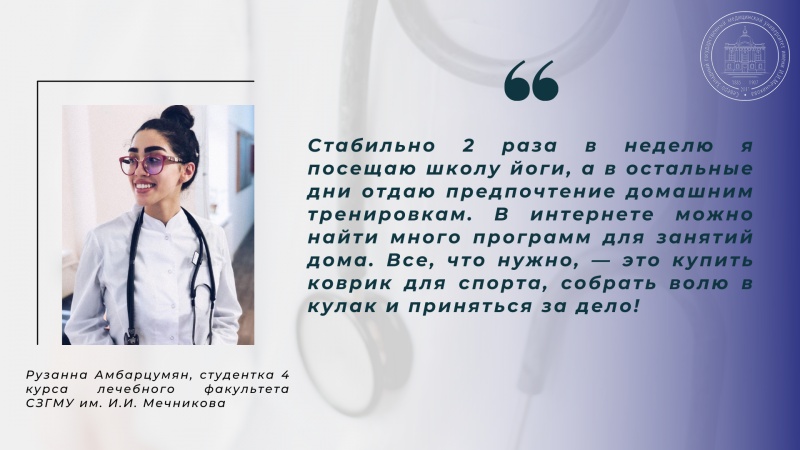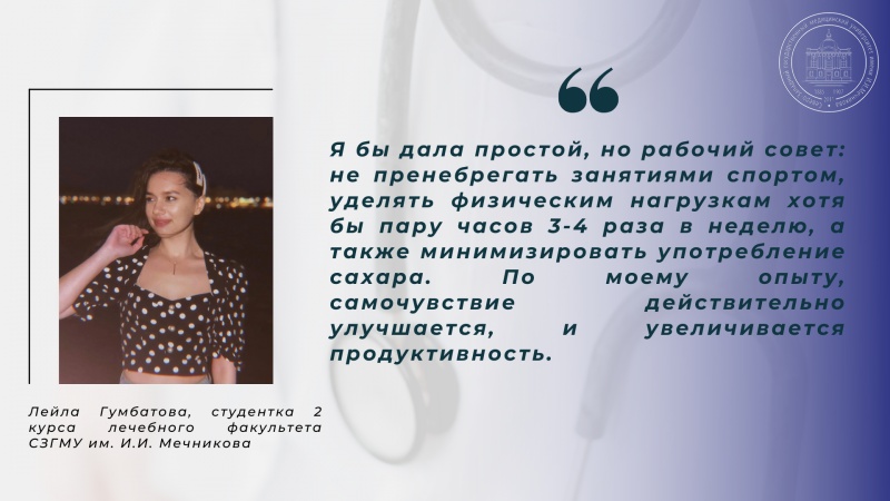 В этот день о здоровом образе жизни, полезных ежедневных привычках, правильном питании и физических нагрузках рассказали врачи и студенты СЗГМУ им. И.И. Мечникова: они поделились простыми, но очень важными советами о том, как поддерживать свое здоровье.