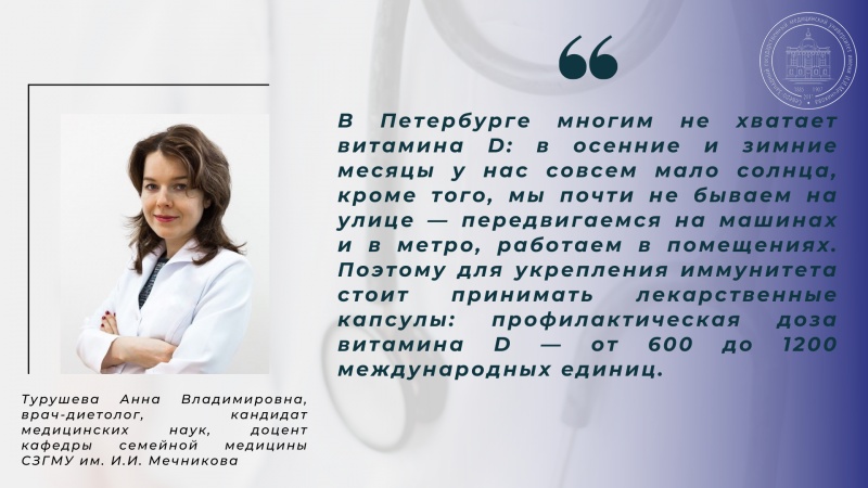 «В Петербурге многим не хватает витамина D: в осенние и зимние месяцы у нас совсем мало солнца, кроме того, мы почти не бываем на улице — передвигаемся на машинах и в метро, работаем в помещениях. К сожалению, получить достаточное количество этого витамина из пищи практически невозможно. Поэтому для укрепления иммунитета стоит принимать лекарственные капсулы: профилактическая доза витамина D — от 600 до 1200 международных единиц. Принимать витамин D в более высоких дозах можно только после консультации врача».