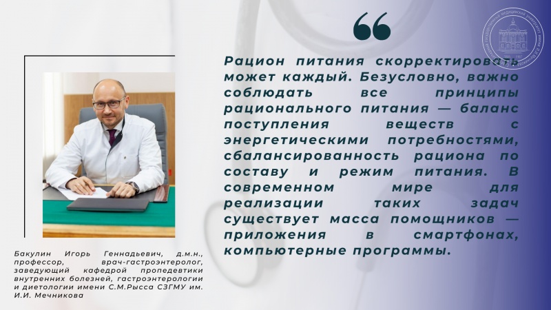 «Рацион питания скорректировать может каждый. Безусловно, важно соблюдать все принципы рационального питания — баланс поступления веществ с энергетическими потребностями, сбалансированность рациона по составу и режим питания. В современном мире для реализации таких задач существует масса помощников — приложения в смартфонах, компьютерные программы».
