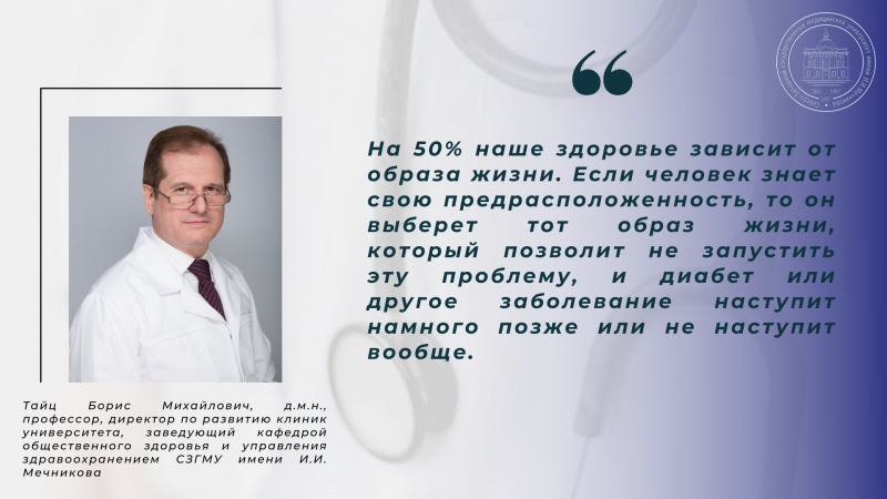 «От медицины, в которую мы вкладываем миллиарды рублей на оборудование, подготовку врачей и т.д., зависит только на 10% наше здоровье — вдумайтесь в эту цифру! От генетики — 25%, еще 20% зависит от экологии, на которую мы не можем повлиять – это государственная проблема, и она, к сожалению, ухудшается. Но ведь 50% — это образ жизни! Если человек знает свою предрасположенность, то он выберет тот образ жизни, который позволит не запустить эту проблему, и диабет или другое заболевание наступит намного позже или не наступит вообще».