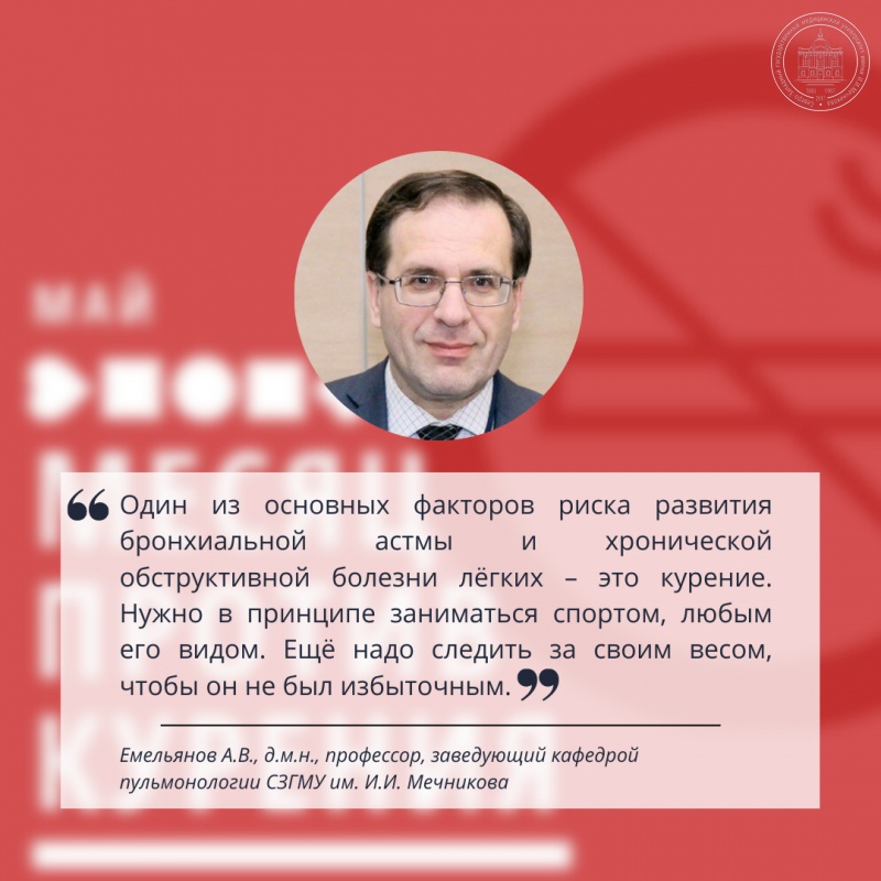 «Один из основных факторов риска развития бронхиальной астмы и хронической обструктивной болезни лёгких – это курение. А для уже заболевшего астмой человека важно, чтобы он избегал контакта с тем аллергеном, который вызвал эту болезнь. Нужно в принципе заниматься спортом, любым его видом. Ещё надо следить за своим весом, чтобы он не был избыточным. Есть такое мнение, что если человек сидит, это все равно, что он курит. Человек в течение дня должен проходить не менее пяти-шести километров. Если мы выполняем эту норму, то уже осуществляем профилактику многих болезней».