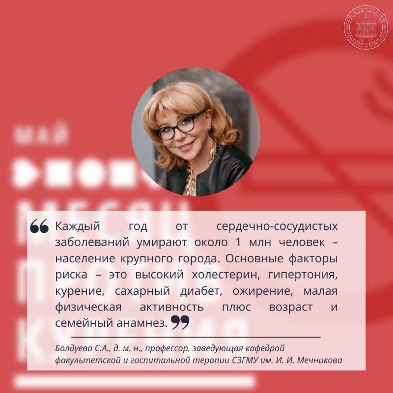 «Каждый год от сердечно-сосудистых заболеваний умирают около 1 млн человек – население крупного города. Причины – инфаркт, ишемическая болезнь сердца, атеросклероз. Предпосылки этих недугов появляются уже с первых дней рождения человека. И затем усугубляются стрессами, отрицательными эмоциями, вредными привычками и различными инфекциями. Основные факторы риска – это высокий холестерин, гипертония, курение, сахарный диабет, ожирение, малая физическая активность плюс возраст и семейный анамнез».
