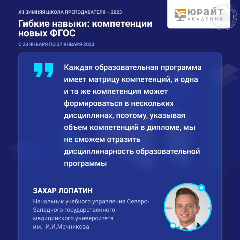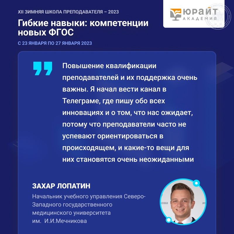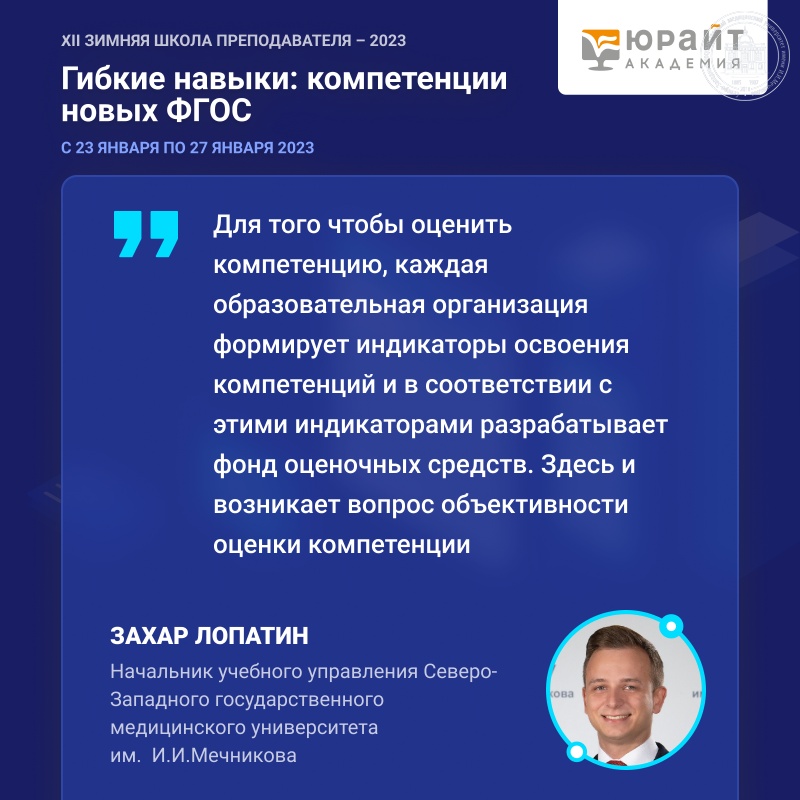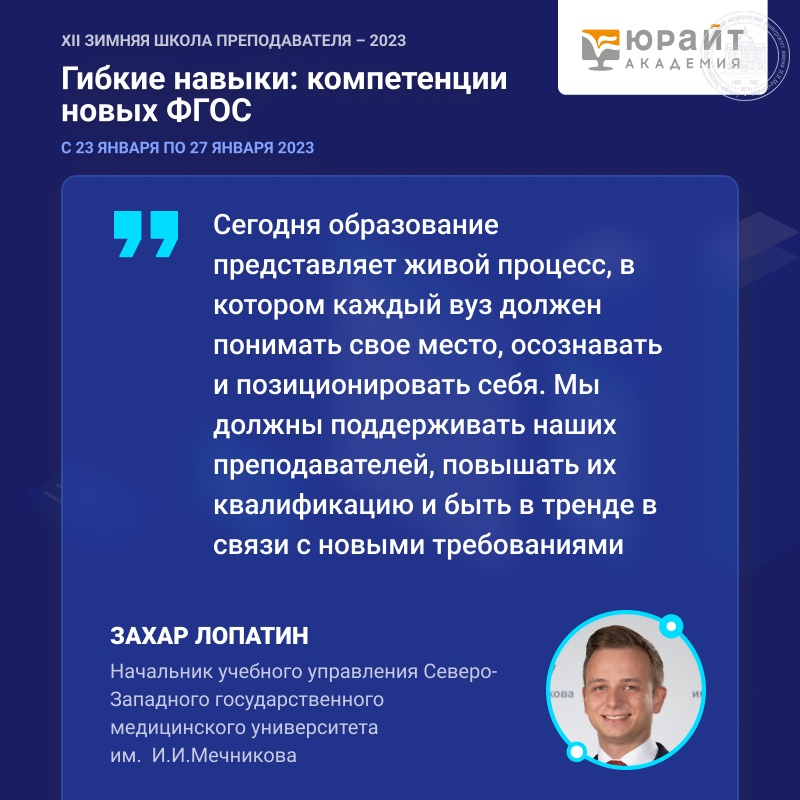 С 23 по 27 января проходит ХII Зимняя школа преподавателя «Гибкие навыки: компетенции новых ФГОС». В Школе участвуют свыше 3500 преподавателей и руководителей учебных заведений из России и зарубежных стран. Организатором конференции выступила Образовательная платформа «Юрайт».