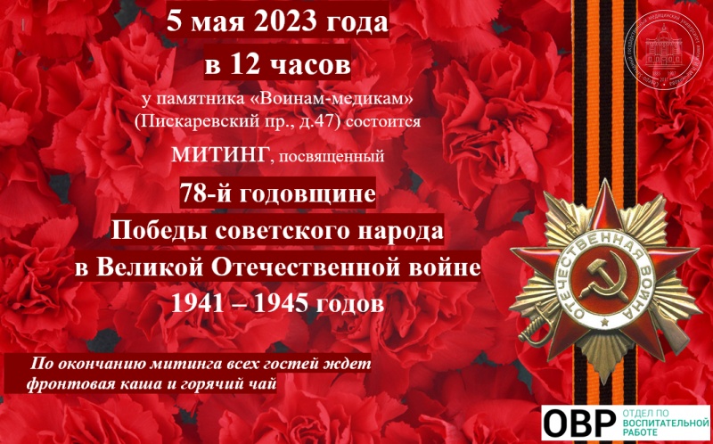 5 мая 2023 года в 12 часов у памятника «Воинам-медикам» по адресу Пискаревский пр., д.47 состоится Митинг, посвященный 78-й годовщине Победы советского народа в Великой Отечественной войне 1941 – 1945 годов.
