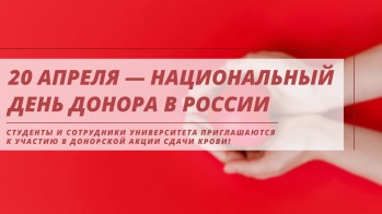 20 апреля в донорском пункте трансфузиологического отделения больницы им. Петра Великого пройдет акция, приуроченная к Национальному дню донора крови в РФ. Студенты и сотрудники Университета приглашаются к участию в донорской акции сдачи крови!