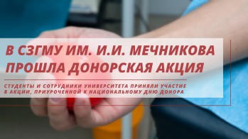 20 апреля 2021 года в отделении трансфузиологии СЗГМУ им. И.И. Мечникова состоялась донорская акция, приуроченная к Национальному дню донора. За три часа приема в донорском пункте сдали кровь 41 человек, из них 36 студентов из СЗГМУ им. И.И. Мечникова, РГПУ им. А.И. Герцена, РГГМУ, БГТУ Военмех им. Д.Ф. Устинова, СПб ГМТУ.