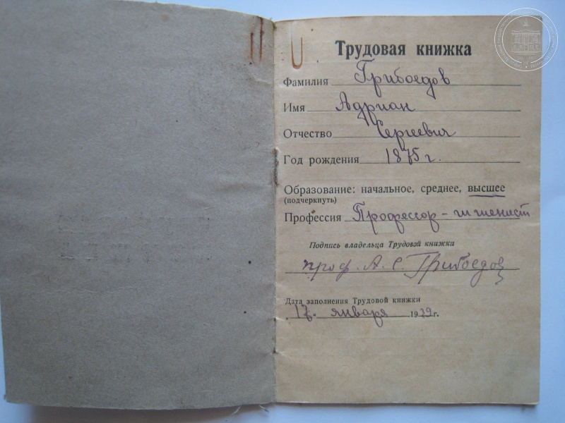 С 1908 г. Адриан Сергеевич по приглашению В.М. Бехтерева стал доцентом кафедры врачебной педагогики Психоневрологического института, где читал объемный курс по педологии, гигиене воспитания, детской психоневрологии, медицинской психологии и дефектологи, адресованный как студентам, так и врачам. Через два года Адриан Сергеевич был избран на должность профессора кафедры врачебной педагогики, а с 1923 г. в Государственном институте медицинских знаний (ГИМЗ), образованном на базе медицинского факультета Психоневрологического института, уже и возглавил кафедру, позднее получившей название кафедры гигиены воспитания. В 1938 г. А.С. Грибоедов был назначен деканом санитарно-гигиенического факультета 2-го Ленинградского медицинского института. Таким образом 35 лет жизни А.С. Грибоедова связаны с нашим учебным заведением (Психоневрологическим институтом – ГИМЗ – 2-м ЛМИ).