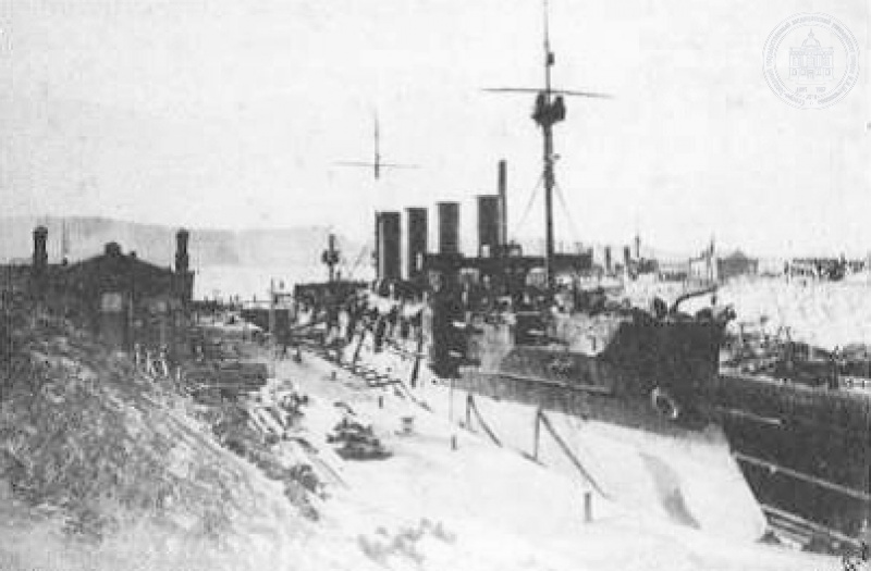 Крейсер «Громобой» в доке, вид на бухту Золотой Рог. Фото А.К. Штейна.